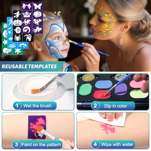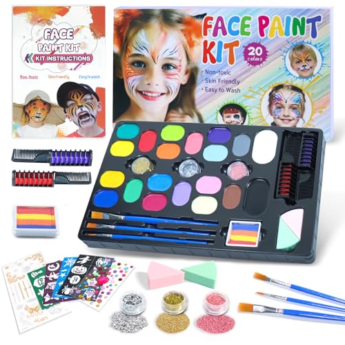AZSJML Trucchi Viso Bambini Carnevale, 20 Colori Kit Trucco Corpo Face Painting Makeup Palette Pittura con 34 Stampini e 3 Pennelli, Kit Trucco Carnevale di Halloween Cosplay, Natale, Pasquale