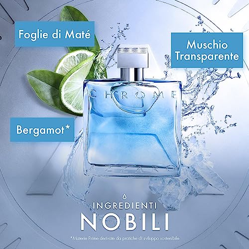 Azzaro Chrome Eau de Toilette, profumo agrumato rinfrescante. Una freschezza morbida e autentica (agrumi, note di muschio bianco) combinata con le note verdi dell'avventura e con l'accogliente accordo di tè legnoso (legno di sandalo, ambra, mate).