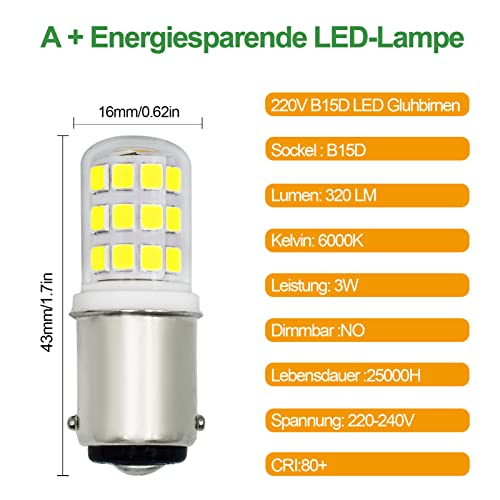 B15D Piccola baionetta LED 3W Equivalente a 30W Alogena AC 230V Bianco freddo 6000K Piccole lampadine 320LM Lampada ricambio per macchina da cucire Cappa luce 360° Angolo fascio Non dimmerabile (2 pz)