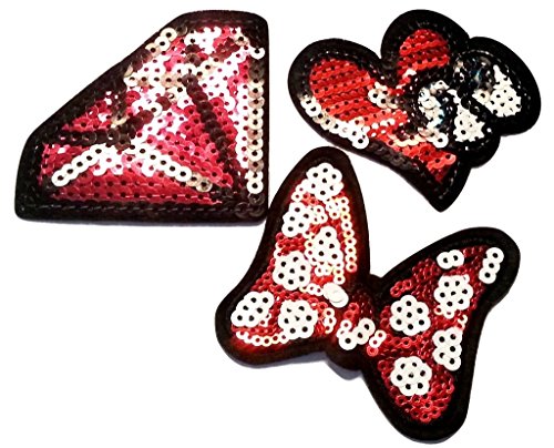B2SEE Toppe Toppa con Paillettes da Cucire termoadesive Patch termoadesiva Applique Applicazioni con Paillettes 3 Pezzi Diamanti Rosso,Cuore Rosso + Capelli Arco Rosso 7cm a Pezzo