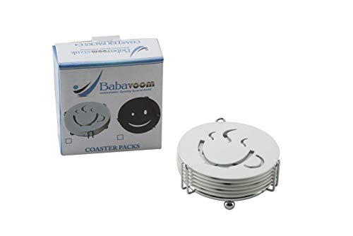 Babavoom - Confezione da 6 sottobicchieri o sottotazze con supporto in metallo cromato, disegno: smiley, colore: nero o bianco White Cup Coasters