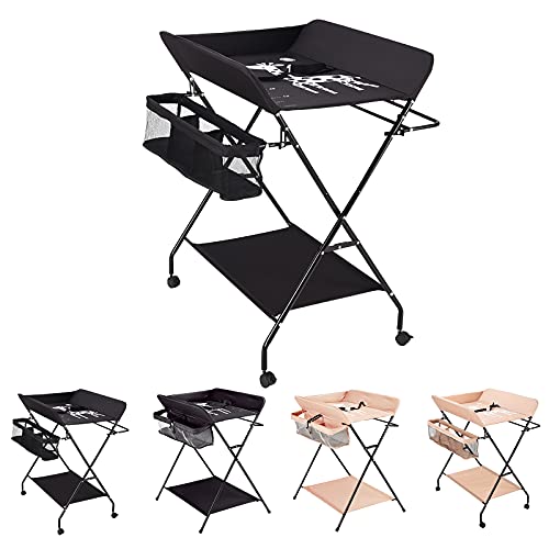 Baby fasciatoio pieghevole - fasciatoio portatile con fasciatoio, cintura di sicurezza e scomparti portaoggetti, salvaspazio e stabile (nero, con ruote)