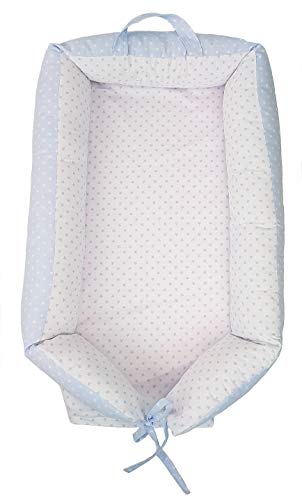Baby nest o culla piccola portatile et reversibile, letto riduttore culla o nido riduttore reversibile perfetta per cullare il bambini. 2 en1: Fatto in tessuto bianco e con stampa di stelle celeste combinati con tessuto celeste e stampa di stelle bianchi. 100% Fabbricato in Spagna con le migliori rifiniture e qualità.