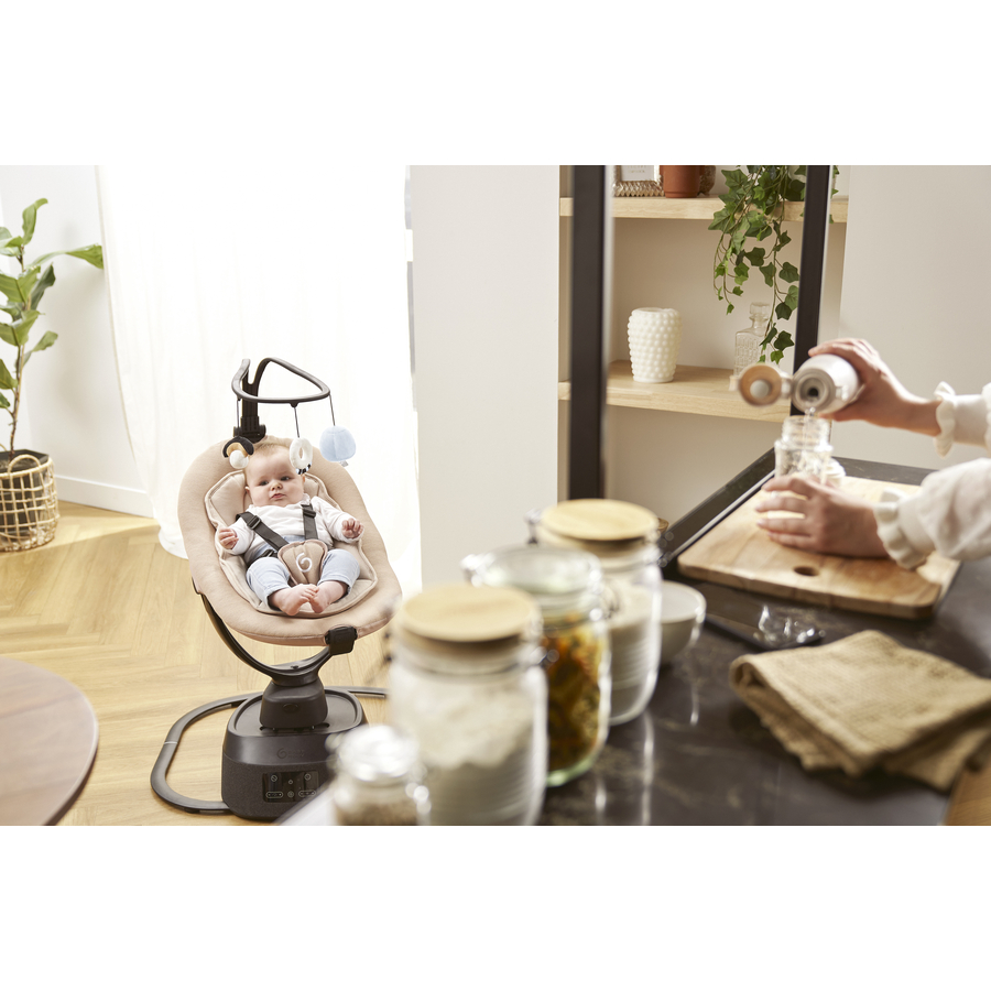Dettagli del prodotto: La prima altalena per bambini con suoni personalizzabili con l'esclusivo tiger e l'intuitiva app Funzione di registrazione per genitori, familiari e amici per toni e suoni personalizzati esclusivamente da Babymoov playlist a tema create Funzione di riproduzione tramite le più diffuse piattaforme di streaming musicale 8 movimenti di dondolio particolarmente delicati (5 velocità) 12 suoni integrati (melodie, rumori bianchi e suoni della natura) Super confortevole: tessuti morbidi e modern e Inserto neonato integrato Tempo di dondolio programmabile (10, 20 o 30 minuti) Sistema di rotazione: la seduta può essere ruotata di 360 5 posizioni di seduta e reclinazione: schienale (3 posizioni) e seduta (2 posizioni) regolabili Cintura di sicurezza a 5 punti Arco di gioco staccabile con 3 elementi di gioco per stimolare tutti i sensi Adatto per bambini dalla nascita fino a 9 kg Materiale e cura: Cuscino di riduzione: Materiale superiore 75 % poliestere, 25 % cotone Materiale di riempimento: 100 % poliestere Schienale: 98% poliestere, 2% elastane Rivestimento: 100% poliestere Elementi di gioco: 100% poliestere Cura: cuscino lavabile in lavatrice a 30° / rivestimento lavabile in lavatrice (programma delicato/lavaggio a mano, senza centrifuga) Si consiglia di utilizzare una rete da bucato. Dimensioni del prodotto: Dimensioni della seduta: L 81 x L 65 x H 79 cm Spazio richiesto sul pavimento: 69 x 63 cm Dettagli tecnici: Alimentazione: funziona con la rete elettrica ( Adapter 2,5 m incluso). Rete elettrica inclusa adapter