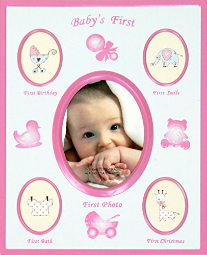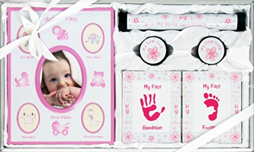 Portafoto “My First Year”, contenitore per certificato di nascita, scatolina per dentino “My First Tooth”, scatolina per ricciolo “My First Curl” e cornici per impronte di manina e piedino “My First Handprint” e “My First Footprint” (etichetta in lingua italiana non garantita).