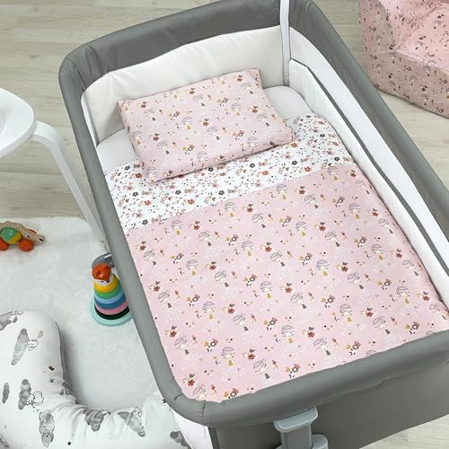 Babysanity Lenzuola Next To Me Compatibili 5 pezzi: Cuscino Neonato Federa Cuscino Piumino Copripiumino Lenzuolo Angoli per Culla Lettino Neonato Chicco Kinderkraft Cam Brevi OEKO-TEX (Fatina)