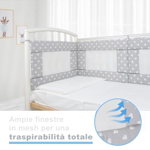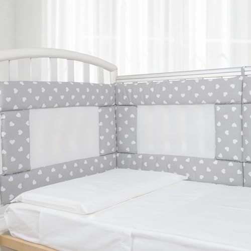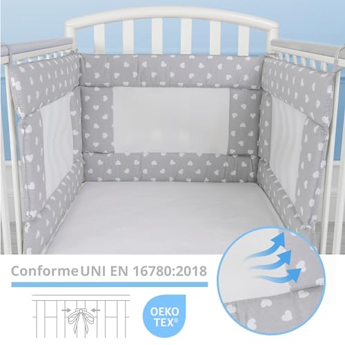 Babysanity - Paracolpi Lettino Ad Alta Traspirazione Dotato Di Sistema Baby Air Mesh Il Paracolpi Culla Morbido ma Consistente Garantisce al tuo Bambino un Ambiente Sicuro per la Nanna (Cuori Grigio)