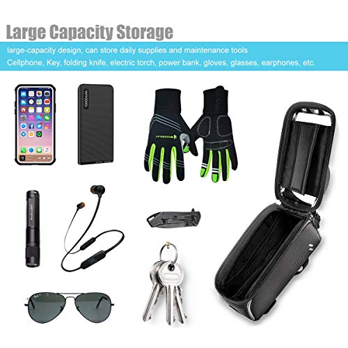GRANDE SPAZIO: Borse da bicicletta impermeabili con spazio sufficiente per lunghi viaggi, contiene un sacco di cose come telefono, batteria, gel energetico, pompa per pneumatici, kit di riparazione, chiavi, portafogli ecc. Puoi anche ascoltare musica o chiamare o ricaricare la torcia mentre guidi utilizzando il foro per auricolari sul fondo.