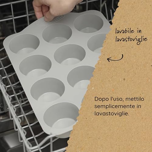 FACILE DA PULIRE ATTRAVERSO ALL'ANTISCIVOLO NATURALE: la teglia per muffin in silicone è facile da lavare e lavabile in lavastoviglie attraverso zie alle proprietà antiaderenti legate al processo