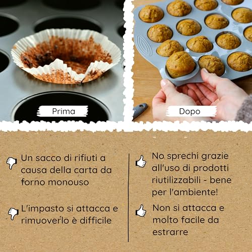 PIÙ SANO, SOSTENIBILE, FELICE: teglia muffin in silicone non solo rende superfluo l'olio, il burro, lo spray da forno e una teglia per muffin completamente unta, ma anche i pirottini di carta monouso