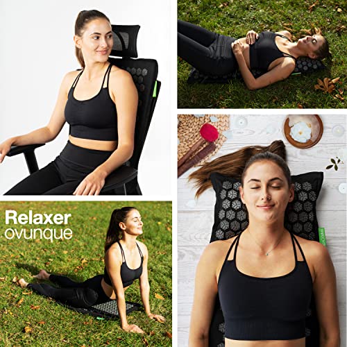 BACKLAxx ® Tappetino agopressione avanzato - Tappeto agopressione per il relax per la schiena, collo, spalle e piedi - Tappetino massaggiante con cuscino, panno e borsa - Materassino relax
