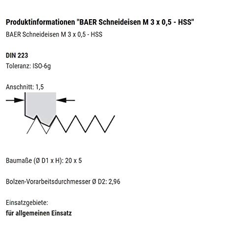 Baer - Filiera filettata M3 HSS, M 3 x 0,5, filettatura metrica regolare, filettatura esterna in acciaio per utensili altamente legato, filettatura metrica esterna