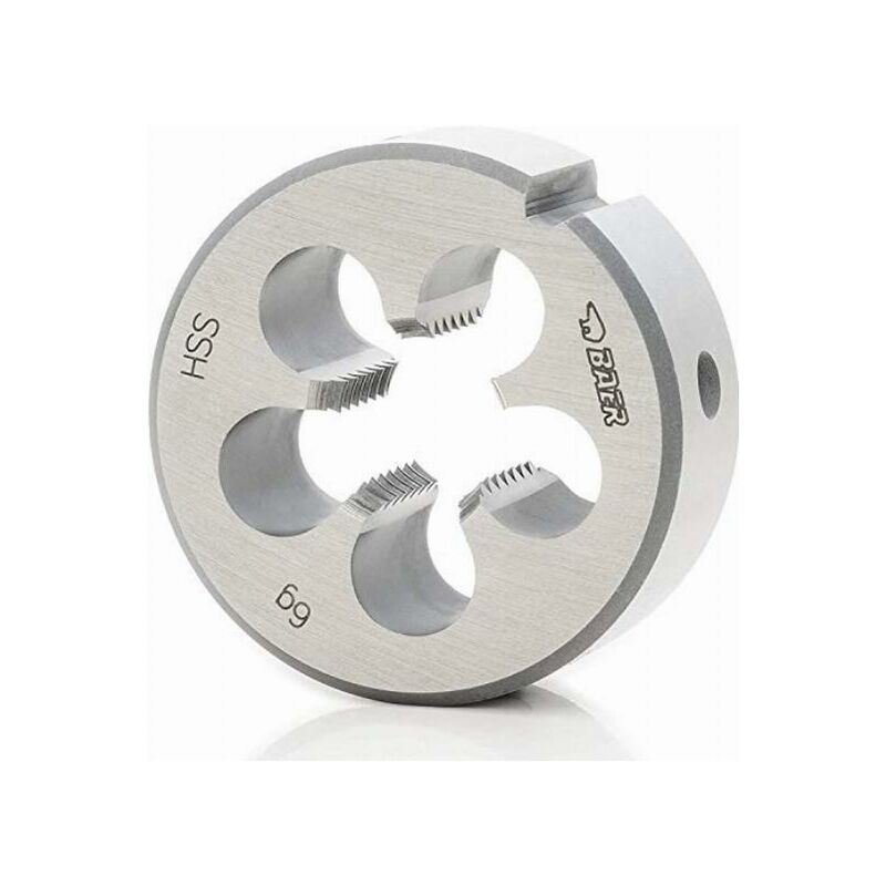 BAER Filiera UNF 1/2 x 20 - HSS | DIN 223 Tolleranza: ISO 6 G taglio: 1,5 Dimensioni albero (Ø D1 x A): 38 x 10 - Bulloni di diametro Ø D2: 12,56 | Campi di applicazione: per uso generale | Filettatura esterna con profilo esterno rotondo si possono utilizzare filiere di fabbricazione. Le nostre filettature convincono oltre alla qualità testata, soprattutto grazie ad un prezzo molto elevato.