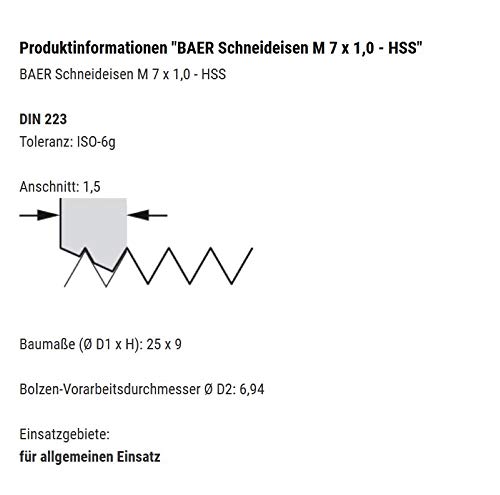 BAER Filiera M 7 x 1,0 - HSS filettatura M7 filettatura esterna filettatrice