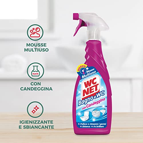 Prodotto: Wc Net Bagno e Wc è studiato per la pulizia dei sanitari e di tutto il bagno, la sua schiuma rimuove lo sporco ostinato e la formula con candeggina igienizza donando brillantezza