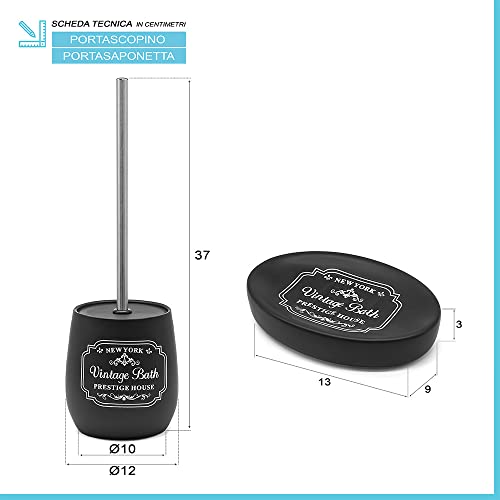 Set bagno completo in Ceramica Nera con stampe a contrasto bianche, INCLUDE dispenser Sapone, portaspazzolini, portasapone e portascopino