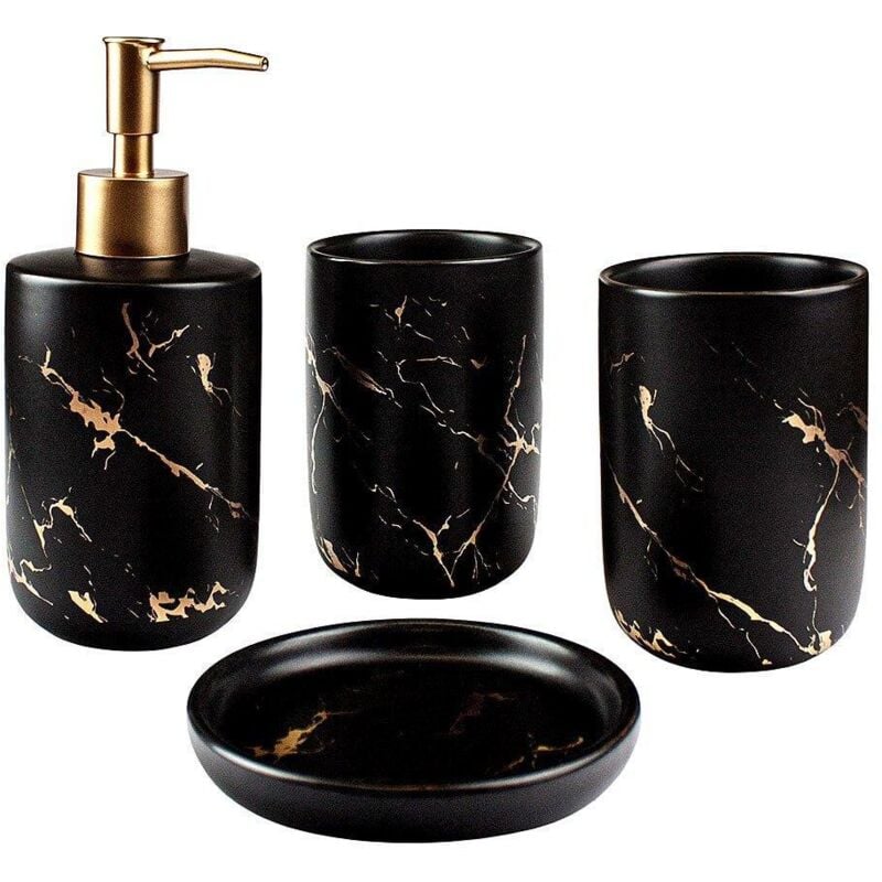 Questo set da bagno diventa un elegante sanitari nella maggior parte dei bagni. Il set è composto da tutti gli accessori da bagno di cui hai bisogno: due tazze, una pompa per sapone e un barilotto per sapone per le mani. Il set è di colore nero con motivo marmorizzato color oro. Oltre a un elegante arredamento per il bagno, questo set ti offre anche uno spazio per il bagno elegante e intelligente. Dai al tuo bagno un tocco di classe e spazio di archiviazione intelligente con questi accessori per il bagno! - Elegante ripostiglio per il bagno in quattro parti - Il set è composto da due tazze, una pompa per sapone e un barilotto per sapone per le mani - Questi accessori per il bagno sono di colore nero con motivo marmorizzato color oro Specifiche: Colore: nero, oro Materiale: ceramica, plastica Dimensioni, portasapone: 2 x 11 cm Altezza, tazza: 11 cm Altezza, pompa sapone: 17 cm La confezione contiene: 2 tazze 1 pompa per sapone 1 portasapone