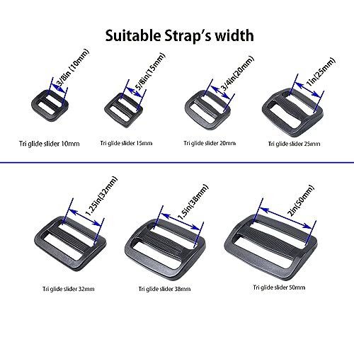 Diverse opzioni di dimensioni: ci sono cursori tri-glide da 25 mm, 32 mm, 38 mm, 50 mm a scelta. Queste misure si riferiscono alla larghezza del cinturino. Quindi è sufficiente misurare la larghezza della cinghia o della cintura sulla mano.