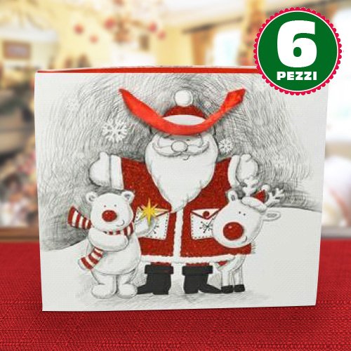 Bakaji 6 Buste Da Regalo Stampa Babbo Natale Classico Con Manici Rossi 26x12x31Cm