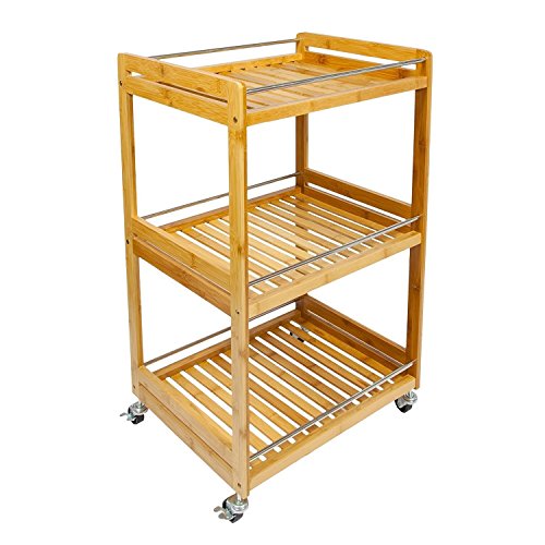 BAKAJI Carrello Cucina o Bagno 3 Scomparti in Legno Bambu' Naturale 4 Ruote 46 x 38 x 76 cm, Carrello da Portata Servizio Bamboo Naturale