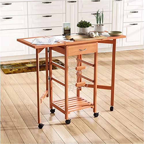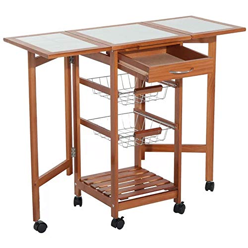 Ciò che rende davvero unico questo fantastico carrello da cucina è il bellissimo piano da lavoro estensibile, infatti aprendo i due piani laterali e posizionando sotto le 2 gambe pieghevoli è possibile estendere il piano d'appoggio fino ad un massimo di 91 cm utile come superfice d'appoggio, come tagliere o per lavorare impasti ecc.., inoltre il piano è rivestito di piastrelle in ceramica di colore bianco che lo rende facile da pulire e riutilizzare.