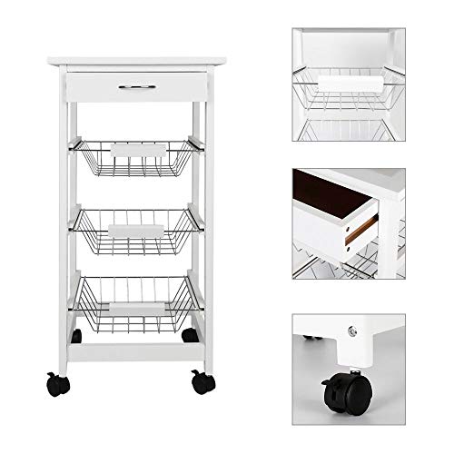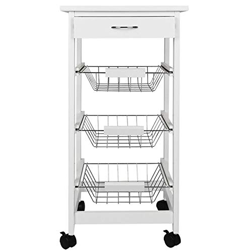 BAKAJI Carrello da Cucina Salvaspazio in Legno MDF Bianco con 3 Cestelli Portafrutta in Acciaio Cassetto Portaposate Piano d'Appoggio Piastrellato e 4 Ruote Girevoli 360 Gradi 37 x 82 cm