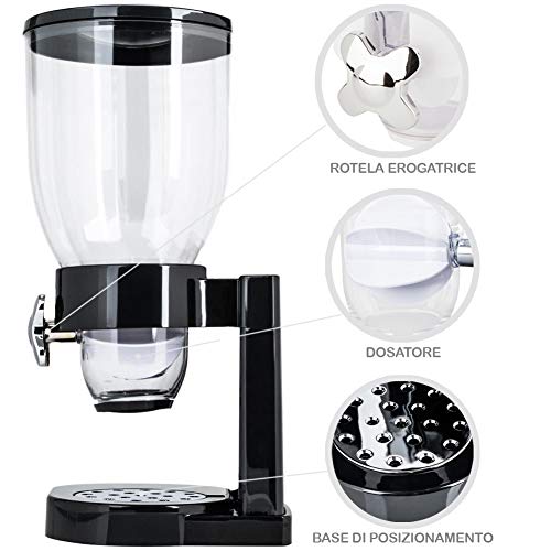 BAKAJI Dispenser Storage Dosatore Distributore Erogatore Cereali Pasta Caramelle Dolci Frutta Secca Singolo con Rotella Contenitore 500gr e Dosatore Interno (Nero)
