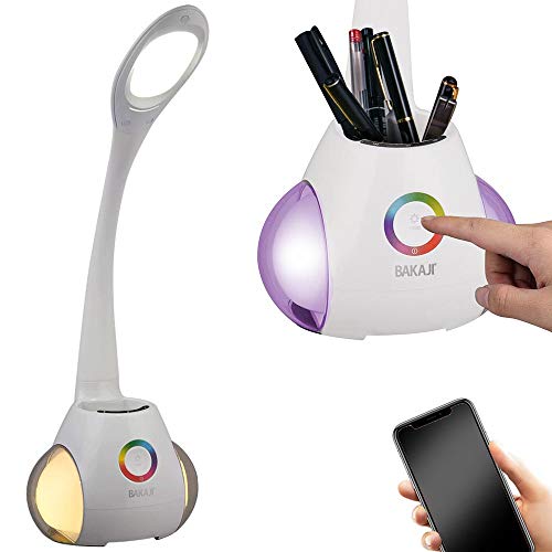 Bakaji Lampada Cassa Altoparlante Speaker Bluetooth da Tavolo Luce LED Dimmerabile Accensione Touch con Luce d'atmosfera RGB con Cambio Colore e Portapenne Collo Regolabile