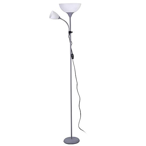 Realizzata interamente con una solida struttura a piantana in metallo verniciato a polvere in un elegantissimo colore grigio dotata di doppio paralume in polipropilene bianco e di braccio flessibile regolabile lungo l'asta della piantana che permette di direzionare il punto luce più piccolo ovunque vogliate, inoltre l' ampia base rotonda dona un eccellente stabilità alla lampada.