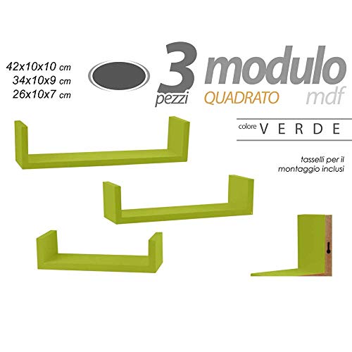 BAKAJI Set 3 Mensole da Parete Moderne Design con Bordi Laterali Mensola Scaffale 1 Ripiano in Legno MDF Varie Dimensioni (Verde)