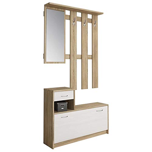 BAKAJI Set Mobili Ingresso Design Moderno con Scarpiera Panca Cassetto Specchio Rettangolare e Appendiabiti Attaccapanni 3 Ganci da Parete Casa Design Moderno in Legno Colore Rovere Bianco