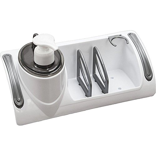 Un pratico organizer da lavello con vari scomparti per riporre accessori e un pratico dispenser per sapone liquido.