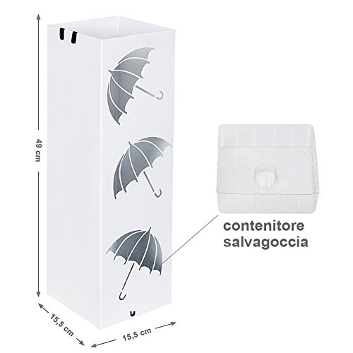 BAKAJI Portaombrelli Stand in Ferro Design Colore Bianco con Vaschetta Salvagoccia e Ganci per Ombrelli Dimensioni 49 x 15,5 cm