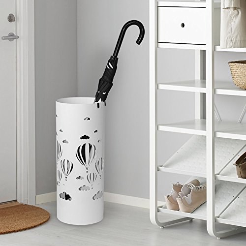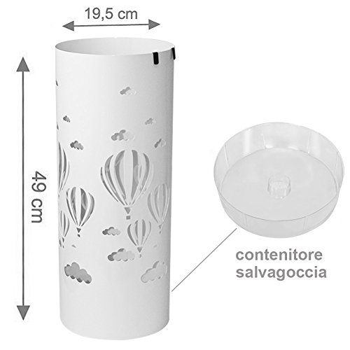 BAKAJI Portaombrelli Stand in Ferro Design Forma Tonda con Vaschetta Salvagoccia e Ganci porta ombrelli, Altezza 49 cm x Diametro 19,5 cm (Bianco, Mongolfiera)