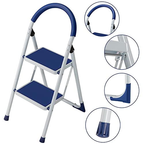 Bakaji Scala Scaletta Pieghevole Salvaspazio con Gradini Antiscivolo e Maniglione di Sicurezza Sgabello Scaletto Struttura in Acciaio e Rivestimento in Gomma Portata massima 150kg (2 Gradini Blu)