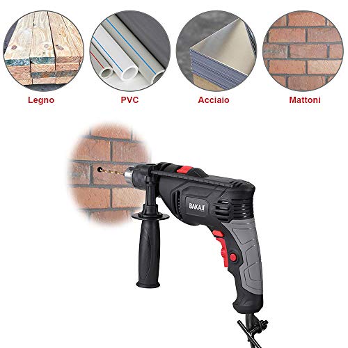 Bakaji Trapano Elettrico a Percussione Potenza 600W Velocita Regolabile 0-3000rpm Mandrino 13mm con Chiavino Funzione Foratura e Martello con Manico Ausiliario e Misuratore di profondità