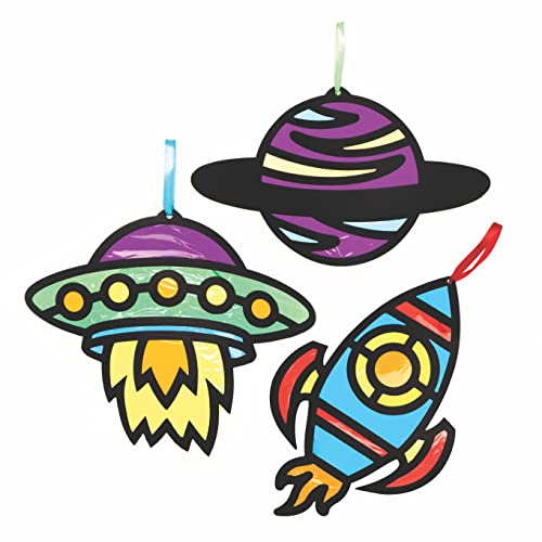 Acchiappasole per bambini: Decora questi insoliti disegni del sistema solare con il cellofan incluso, poi mettili in un posto soleggiato per un effetto vetro colorato. I nostri kit di acchiappasole per bambini sono fatti di cartone facile da decorare. La colla è necessaria.