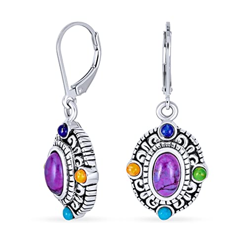 Bali Stile Multicolor Gemstone Viola Stabilizzato Turchese Ovale Incorniciato Penzoloni Levaback Orecchini Donne Sterling Argento