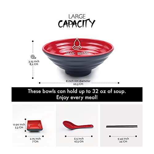 Balibetov Ciotole Giapponesi per Ramen Set - Include 4 Ciotola Ramen in Melamina, Bacchette, Cucchiai e Piccolo Piatti Giapponesi per Salsa - Ideale Per Zuppe Asiatica o Pho- 2 sets, 8pcs (Rosso, 2)