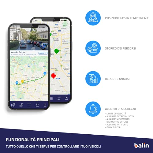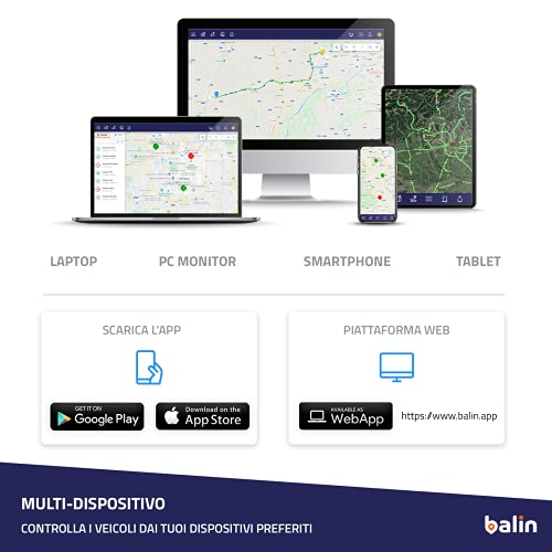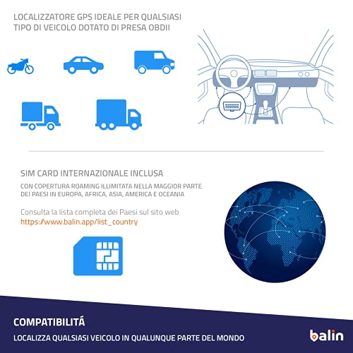 Balin.app - Mini Localizzatore GPS professionale per veicoli, con SIM card e traffico dati, tutto incluso. Installazione rapida con presa OBD del veicolo. Controlla i veicoli da Portale Web e App.