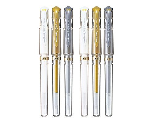 Uni Ball Signo, UM-153, gel, 2 confezioni da 3 penne rollerball: 1 penna color oro, 1 penna color argento, 1 penna colore bianco.