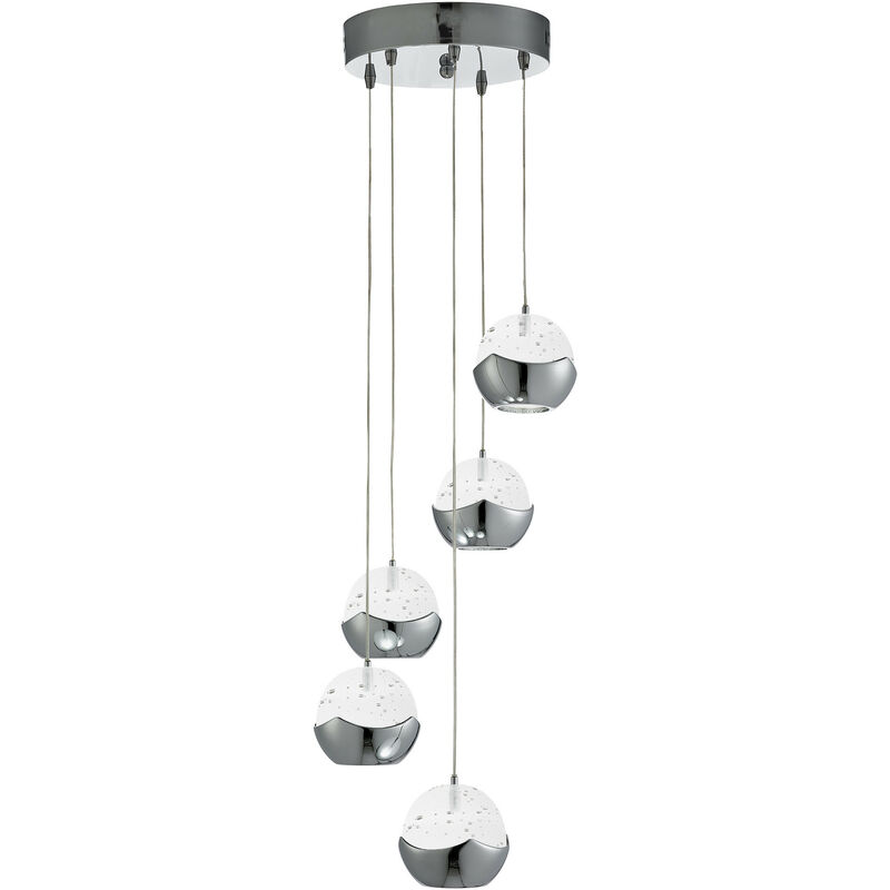 Searchlight Ice Ball - Sospensione a grappolo a spirale a LED a 5 luci cromate | Finitura: Chrome | Classificazione IP: IP20 | Altezza (cm): 102 | Diametro (cm): 26 | Numero di luci: 5 | Tipo di lampada: LED | Kelvin: bianco caldo | Lumen: 1500 | Potenza (max): 6 | Peso (kg): 4.2 | Classe: 1 (a terra) | Lampadina inclusa: sì