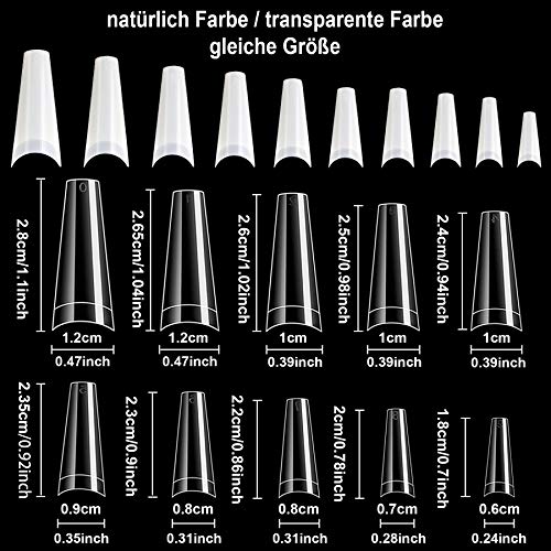 Contenuto della confezione: - Riceverai 500 unghie trasparenti e 500 punte francesi naturali. Utilizziamo scatole di plastica trasparente per confezionare in base alle dimensioni. Ogni scatola ha 10 misure e ogni dimensione ha 50 pezzi. È possibile regolare la dimensione delle unghie in base alle dimensioni dei vostri punti.