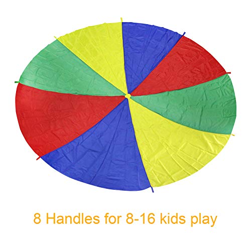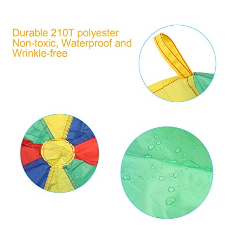 Buona qualità: i nostri paracadute sono robusti e robusti. Realizzato in materiale poliestere 201T non tossico ecologico e resistente, resistente alla putrefazione e impermeabile. Le doppie cuciture aumentano la loro durata, garantendo un uso a lungo termine. 8 maniglie a cinghia consentono a molti bambini di giocare insieme.