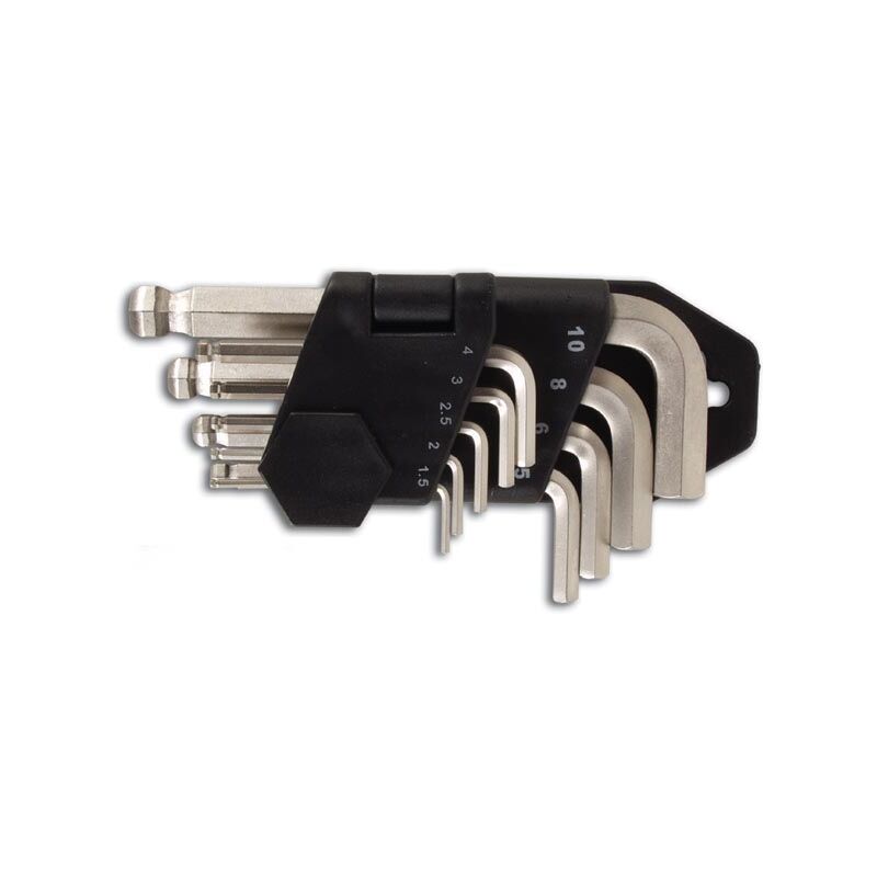 Caratteristiche fisiche Forma: Forma a L Numero di pezzi: 9 Dati tecnici Omologato VDE: No Incluso Contenuto del set: - Esagono: 1,5 x 45 mm, 2 x 50 mm, 2,5 x 55 mm, 3 x 60 mm, 4 x 65 mm, 5 x 72 mm, 6 x 90 mm, 8 x 100 mm, 10 x 112 mm Custodia per il trasporto inclusa: Sì Informazioni di base Colore: Metallo Colore aggiuntivo: Nero Profondità: 25 mm Altezza: 135 mm Larghezza: 70 mm Peso: 230 g Materiale: CrV (acciaio al cromo vanadio)