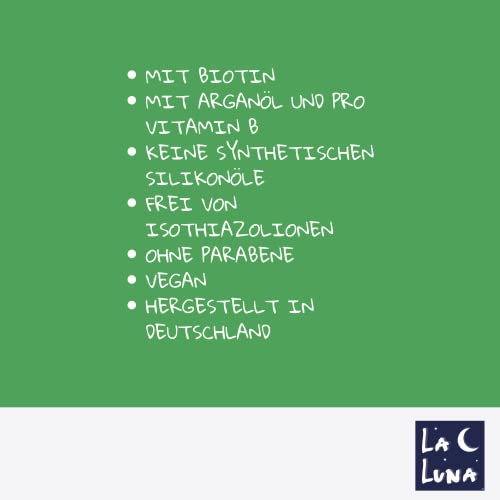 Sicuro grazie agli ingredienti di alta qualità: il nostro balsamo LA LUNA contiene olio di argan marocchino, di alta qualità per vitamina B e biotina. È testato sulla pelle ed è appositamente progettato per lavare i capelli di neonati e bambini. Questo balsamo per capelli è privo di parabeni, isotiazolinoni, oli di silicone sintetico. Produciamo vegani, puri ed equi in Alnd, utilizziamo ingredienti di alta qualità con cui rafforziamo il benessere dei nostri bambini.