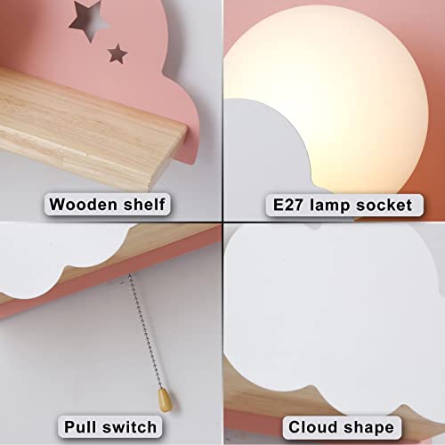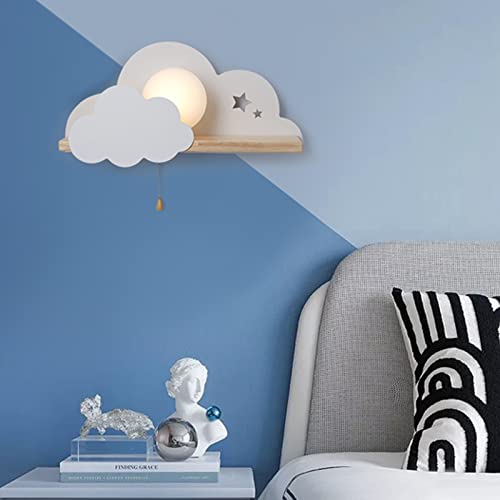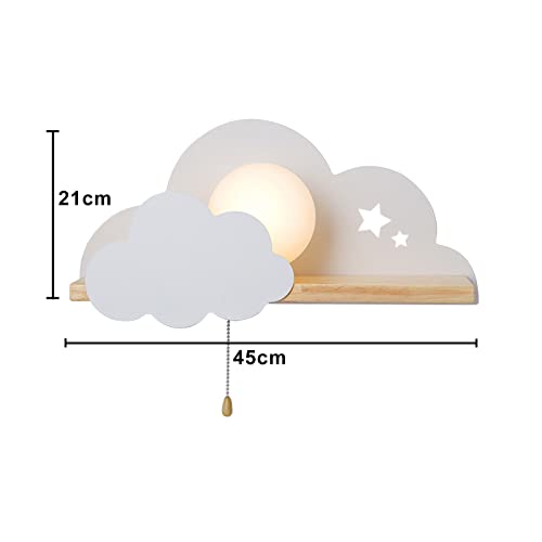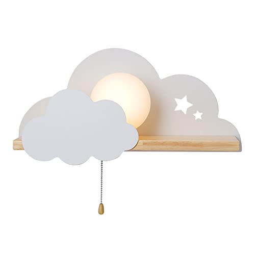 Bambini Applique Forma Nuvola Interno Lampada da Parete, con Interruttore a Tirare Luce da Comodino con Mensola in Legno Luce da Comodino Decorare per Studia Soggiorno Camera da Letto,Bianca
