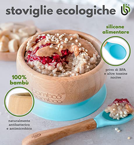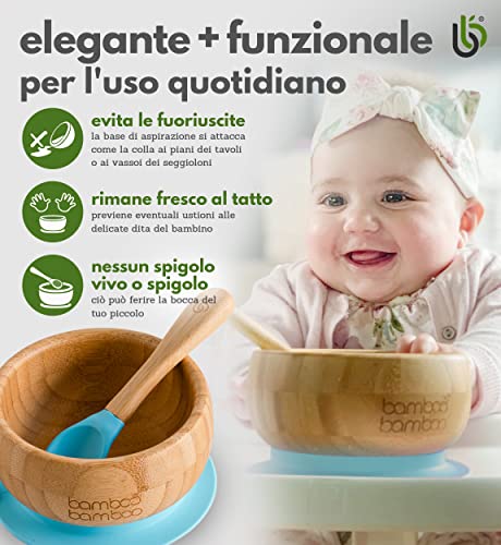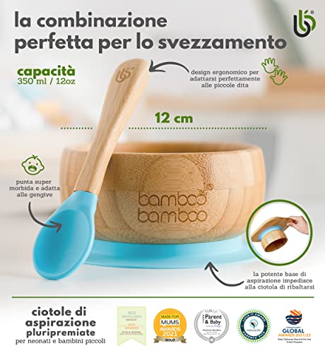 Set Bambino Ciotola con Base a Ventosa e Cucchiaio Coordinato - 350 ML, Ciotola per la Pappa Stay Put con Base a Ventosa, Bamb Naturale(Blu)
