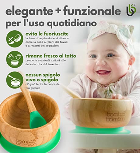 Set Bambino Ciotola con Base a Ventosa e Cucchiaio Coordinato - 350 ML, Ciotola per la Pappa Stay Put con Base a Ventosa, Bamb Naturale(Verde)