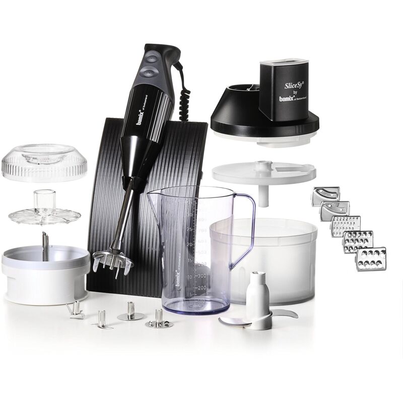 Lama multiuso, Frusta, Mixer, Lama per carne, Supporto da banco, Bicchiere da 1,0 l, SliceSy, Processor (con Powder disc) Potenza motore: 200W, Motore AC Doppio isolamento Il box più completo del primo robot ad immersione in grado di mixare, frullare, emulsionare, montare, impastare, tritare (anche il ghiaccio) tutto in meno di un minuto - BAMIX - Réf.: MX105025 BAMIX BOX BLACK de chez BAMIX